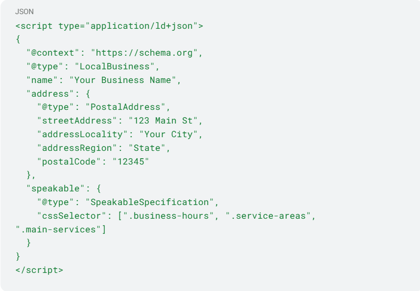 “Speakable” schema is a specific property that identifies which parts of your webpage are particularly suitable for text-to-speech conversion. When someone asks Google Assistant or Siri a question about local businesses, this markup helps voice assistants know exactly which sections of your content to read aloud.